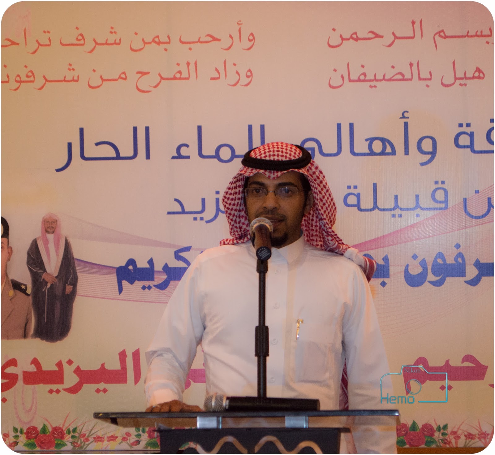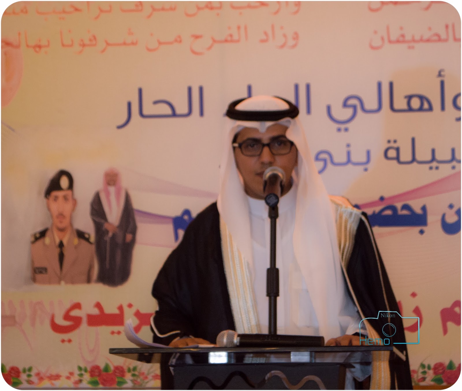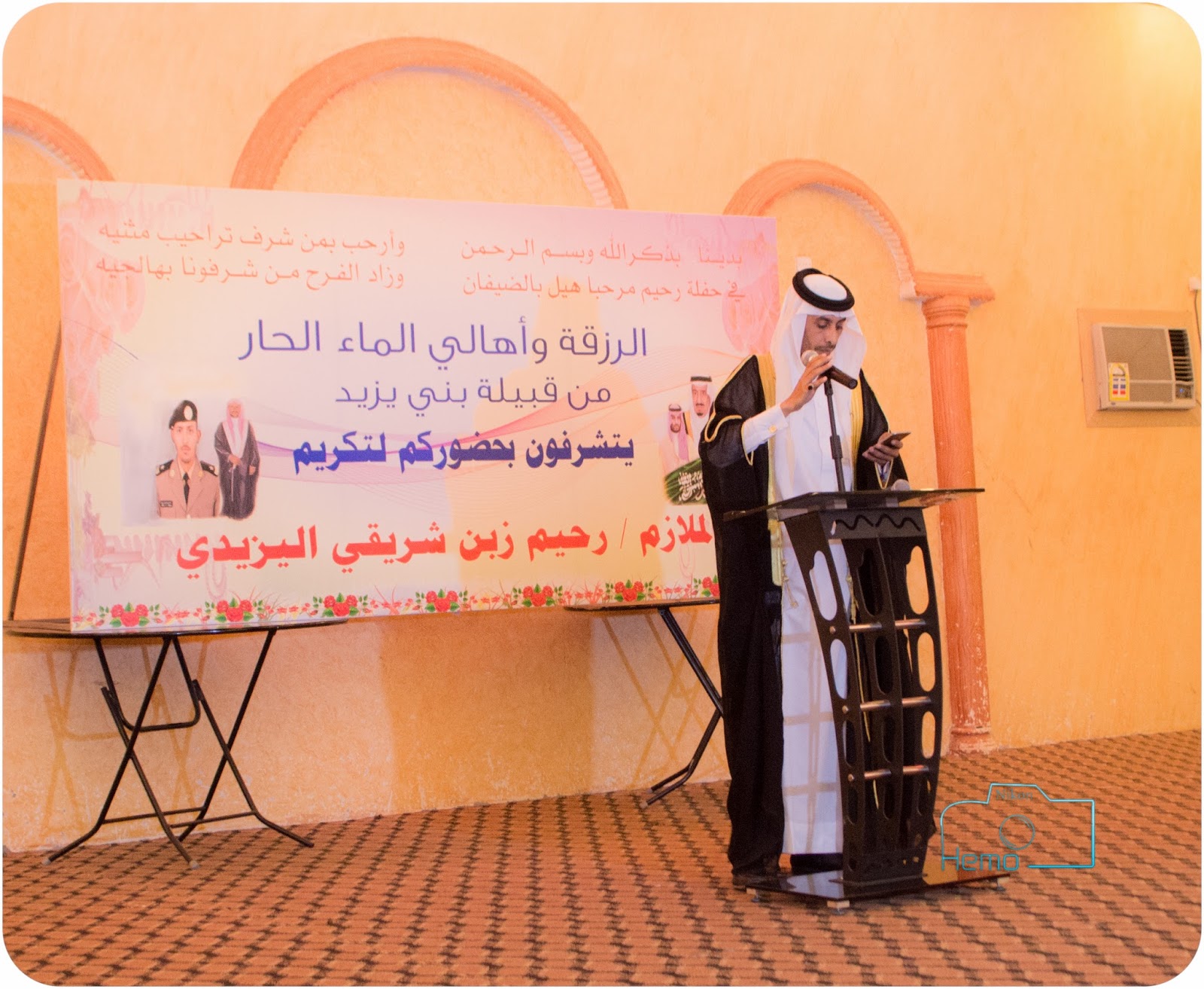 إحتفلت مساء السبت ٤-١٠/ ١٤٣٧هـ قبيلة بني يزيد بإبنهم الملازم / رحيم بن زبن اليزيدي وذلك بمناسبة تخرجه من كلية الملك فهد الأمنية بحضور مشايخ وأعيان القبيلة وبحضور نخبة من أعضاء تواصل عمرين ومعلمي وزملاء المحتفى به ، حيث بدأ الحفل بعد صلاة العشاء بآيات من القرآن الكريم تلاه كلمة ترحيبية لشيخ قبيلة آل حسن الشيخ خالد بن قبيل اليزيدي رحب من خلالها بالحضور بعد ذلك ألقى الشيخ حسن بن علي الحنيطي كلمة نيابةً عن أعضاء تواصل عمرين هنأ فيه الملازم /رحيم بن زبن على التخرج وإشتملت كلمته على المباركة للجميع بحلول عيدالفطر المبارك والإستنكار على ما حصل من أعمال إرهابية إستهدفت أمن الوطن والمواطن وحث الجميع على الوقوف بجانب هذا الوطن قلبآ وقالبآ ونكون يد واحدة بعد ذلك ألقى الملازم /رحيم بن زبن كلمة شكر فيها كل من حضر وشرف هذه المناسبة وكل من شارك وأشرف على تنظيم هذا الحفل وفي ختام الحفل جرى تسليم هدايا عينية من مشايخ وأعيان قبائل بني يزيد والقبائل المجاورة وأيضآ هدايا من زملاء وأصدقاء الملازم ومشاركة من شعراء النظم و العرضة ثم فقرة الشيلة وفي ختام الحفل قدم الأستاذ يزيد بن زبن اليزيدي كلمة شكر فيها الجميع على الحضور والمشاركة.